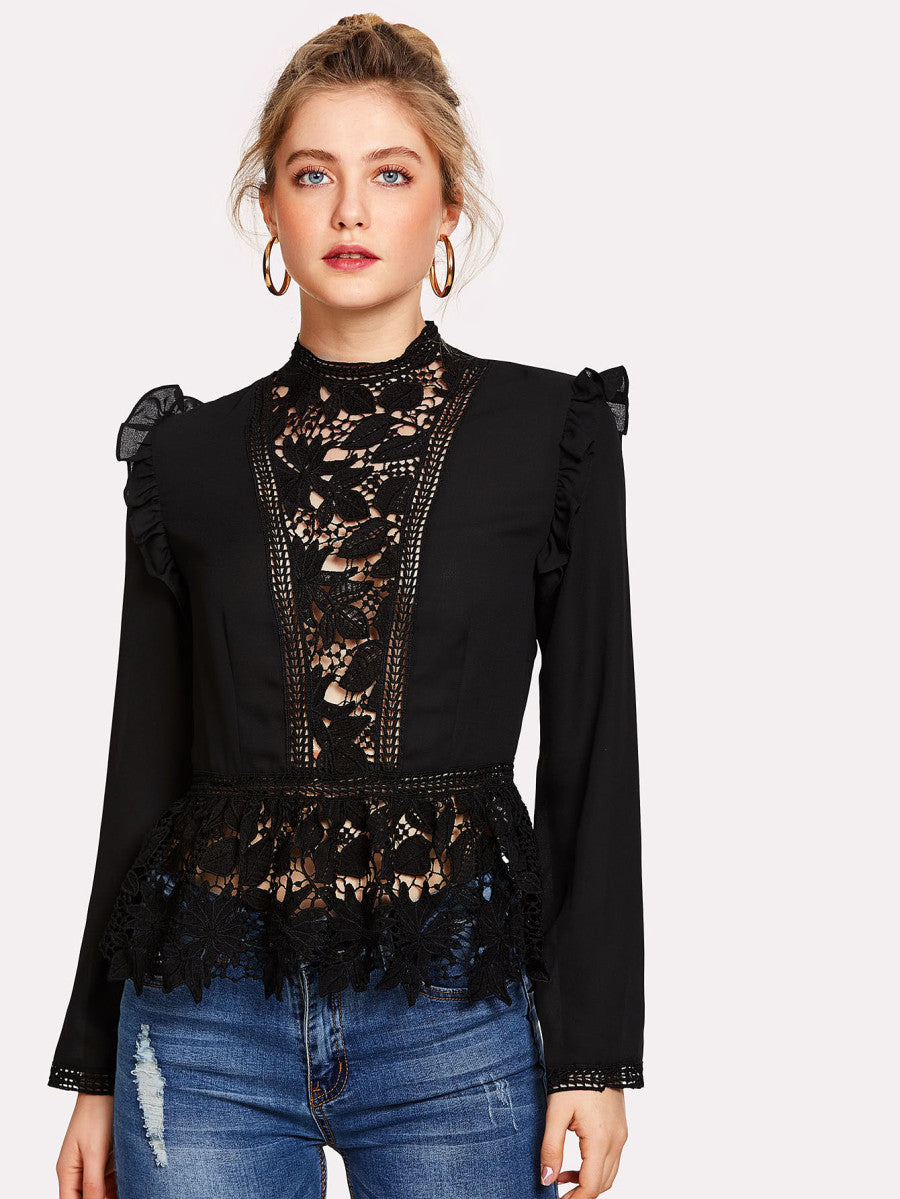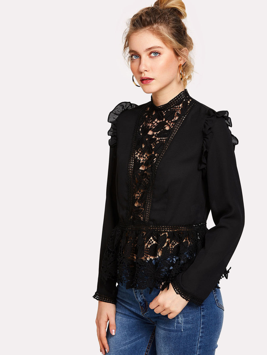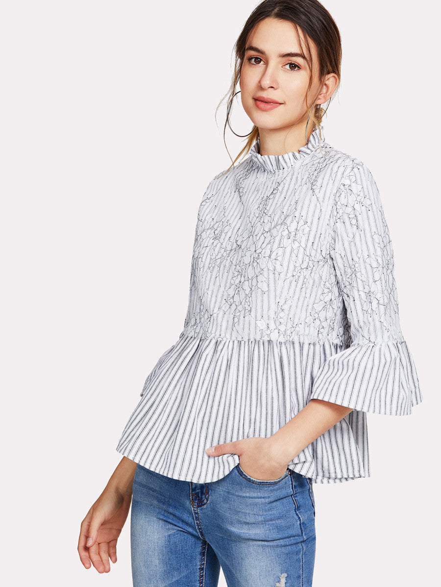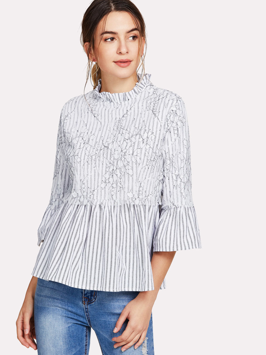 Frill Trim Bishop Sleeve Smocked Hem Blouse